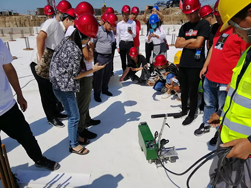 在隨后的項目參觀中,合伙人通過參與熱風焊接TPO卷材性能的講解、實操等環節,了解東方雨虹的產品和工法,以及如何提升工程質量、有效縮短工期。