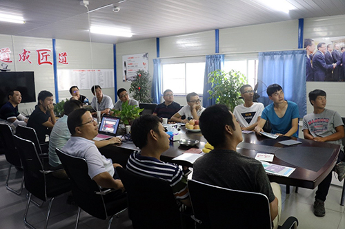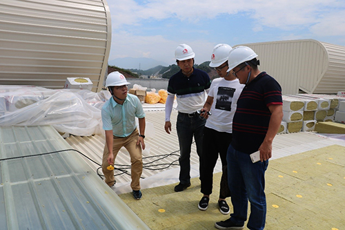 集團TPO平臺技術(shù)工程師姜云飛為考察團講解了TPO防水材料的發(fā)展、應(yīng)用領(lǐng)域、施工工藝及經(jīng)典案例,重點介紹了TPO防水材料在金屬屋面單層外露的施工工藝。在隨后的屋面TPO現(xiàn)場施工參觀中,考察團也針對TPO細部節(jié)點施工問題提出疑問,工程師都一一予以解答。