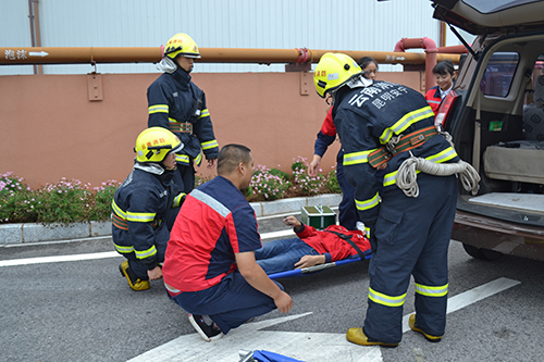 隨著長空一陣陣消防警報聲的嘶鳴,演練正式拉開序幕。現場各救援小組及時響應,聽從指揮,不到十分鐘,所有現場員工都成功疏散到安全區域,消防官兵也在第一時間趕到現場處置,將大火撲滅。醫療救護小組人員在演練中成功將一名受傷昏迷的員工用擔架抬出,并給其做了傷口處理包扎、心肺復蘇。