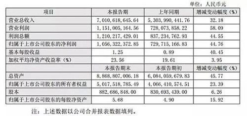 二、經營業績和財務狀況情況說明   報告期內,公司實現營業總收入7,010,618,645.64元,較上年同期增長 32.18%,主要系隨著公司品牌影響力不斷提升,產品銷量同比增長,材料銷售業 務和施工服務業務規模均有所增長所致;營業利潤1,151,005,164.56元,較上年 同期增長58.09%,利潤總額1,210,217,429.01元,較上年同期增長44.55%,歸屬 于上市公司股東的凈利潤1,056,322,372.85元,較上年同期增長44.76%,基本每 股收益1.25元,較上年同期增長40.45%,主要原因是報告期公司營業狀況整體向 好,主要產品的銷售收入、施工收入繼續增加,毛利潤逐步提高所致。 報 告 期 公 司 財 務 狀 況 良 好 , 截 止 2016 年 12 月 31 日 , 公 司 總 資 產 8,868,807,006.18元,較本報告期初增長了45.77%,主要是公司經營規模擴大所致。