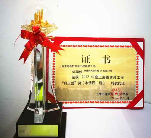 8月,上海東方雨虹參建的天緣華城C1地塊1#樓、2#樓榮獲2015年度上海市建設(shè)工程“白玉蘭”獎(市優(yōu)質(zhì)工程)榮譽稱號。 上海市建設(shè)工程“白玉蘭”獎是由上海市建筑施工行業(yè)協(xié)會頒發(fā),旨在促進(jìn)上海建筑業(yè)誠信建設(shè),提升上海市建設(shè)工程質(zhì)量水平,提高企業(yè)市場競爭力和品牌影響力,同時也培養(yǎng)了一批批能工巧匠和優(yōu)秀項目管理人才,錘煉了一支支素質(zhì)優(yōu)良的施工隊伍,推動了上海建筑業(yè)的健康發(fā)展。 2010年至今,上海東方雨虹參建的白玉蘭項目已達(dá)40余個,此次獲獎的天緣華城項目位于上海市祁連山路,上大板塊,地理位置優(yōu)越,是由大華集團投資建設(shè)。上海東方雨虹作為大華集團防水供應(yīng)商,已與大華集團合作十余年之久。此項殊榮不僅使上海東方雨虹區(qū)域品牌形象得到進(jìn)一步提升,擴大了公司在華東市場的影響力,更是雙方合作共贏的體現(xiàn),為雙方更深入的合作奠定了堅實的基礎(chǔ)。 上海東方雨虹自成立以來,一直踐行“為人類為社會創(chuàng)造持久安全的環(huán)境”的企業(yè)使命,致力于“讓老百姓住上不漏水的房子”。東方雨虹不僅專注高品質(zhì)的產(chǎn)品,更專注于為客戶提供系統(tǒng)服務(wù),成為集產(chǎn)品、技術(shù)、服務(wù)和解決方案為一體的全球化防水系統(tǒng)服務(wù)商。在產(chǎn)品質(zhì)量、施工質(zhì)量、服務(wù)質(zhì)量管控方面始終高標(biāo)準(zhǔn)、嚴(yán)要求,堅持精益求精,著力打造質(zhì)量優(yōu)質(zhì)工程項目。