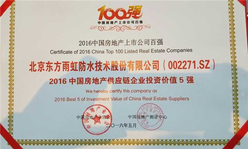 5月26日,由中國房地產(chǎn)業(yè)協(xié)會、中國房地產(chǎn)測評中心聯(lián)合開展的“2016中國房地產(chǎn)上市公司測評成果發(fā)布會暨上市房企高峰論壇”在香港盛大舉行,《2016中國房地產(chǎn)上市公司測評研究報告》等測評研究成果火熱出爐。東方雨虹獲評“2016中國房地產(chǎn)供應鏈上市公司投資價值5強”。