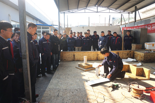 下午,《單程防水卷材屋面工程技術(shù)規(guī)程》及《TPO事業(yè)部施工流程梳理及材料管理》的宣貫,讓與會(huì)人員明確掌握了工程技術(shù)及施工過程中的規(guī)章制度,項(xiàng)目經(jīng)理組和工人代表組也就項(xiàng)目管理的經(jīng)驗(yàn)與施工技術(shù)作了分享,新同事們?nèi)绔@至寶,現(xiàn)場(chǎng)提問、討論同步進(jìn)行。 頒獎(jiǎng)環(huán)節(jié),現(xiàn)場(chǎng)為TPO事業(yè)部優(yōu)秀項(xiàng)目經(jīng)理王海東、崔巖,優(yōu)秀施工班組張廣志,優(yōu)秀施工員李冰,優(yōu)秀新人鐘魚,優(yōu)秀施工隊(duì)長高明坤等人頒發(fā)獎(jiǎng)勵(lì)及證書。 本次培訓(xùn)還組織TPO細(xì)部節(jié)點(diǎn)實(shí)操大賽,由2015中國屋面防水大師徐龍瀟現(xiàn)場(chǎng)演示陰陽角和管根的標(biāo)準(zhǔn)化施工實(shí)操及講解。TPO事業(yè)部的所有施工管理人員及班組組長聚精會(huì)神觀看,精益求精的施工工法引來陣陣驚嘆。