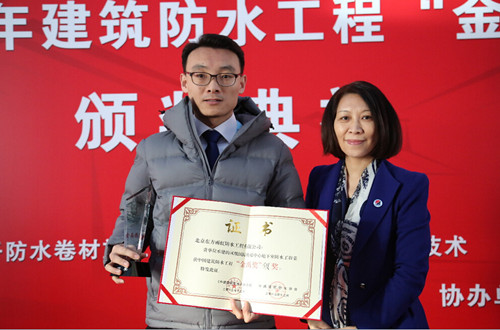 東方雨虹經(jīng)濟(jì)技術(shù)部經(jīng)理助理王強(qiáng)代表公司領(lǐng)取“金禹獎(jiǎng)”銀獎(jiǎng)