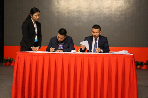 在峰會的最后,長沙洛迪環保科技有限公司總經理吳浩提出了對經銷商的“超級優惠提案”,借助東方雨虹強大的資金、政策扶持,此次活動力度可謂空前,當場成功簽約一百多家加盟合作商。 下午,長沙洛迪環保科技有限公司與各地新經銷商正式進行簽約儀式,各經銷商們在主持人的提示下先后上臺與洛迪總經理吳浩簽訂代理合同。 簽訂代理合同