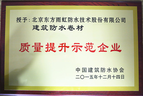 12月14日,中國建筑防水協會第七次會員大會暨“全國建筑防水行業質量提升大會”在京舉行。北京東方雨虹防水技術股份有限公司在會上被評為“質量提升示范企業”。   2015年9月,在國家質檢總局的指導下,由中國建筑防水協會聯合地方防水社團組織及骨干企業開展的建筑防水行業“質量提升萬里行”活動啟動,東方雨虹作為“建筑防水行業質量萬里行”典型單位,在會上被授予“質量提升示范企業”稱號。