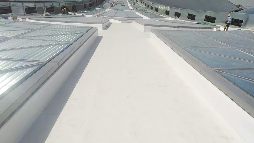 該項目屋面防水等級為一級,在屋面圍護系統中,指廊部分采用1.5mm織物內增強型TPO防水卷材設置于鍍鋅鋼板與巖面保溫層間,通過鍍鋅鋼支座機械固定于幾字形檁條,搭接邊采用熱風焊接工藝。核心區與指廊區采光帶間、采光帶與屋面間通過天溝進行分隔,天溝部分采用2.0mm織物內增強型TPO防水卷材,防水層采用底部無穿孔固定+天溝側壁滿粘的工法,防水層完成后卷材直接外露使用。