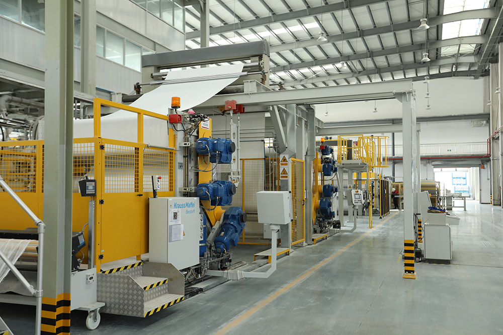 青島東方雨虹廠長閆瀟彬帶領調研組參觀生產基地的高分子卷材、瀝青卷材、水性涂料與砂漿車間,并對目前的產品體系、研發創新、建設進展等情況進行全面介紹。閆瀟彬表示,在科學、合理、全面的防控防護措施下,青島東方雨虹目前已實現全面復工,并將進一步帶領全員做好安全防護,高質量高效保證生產。