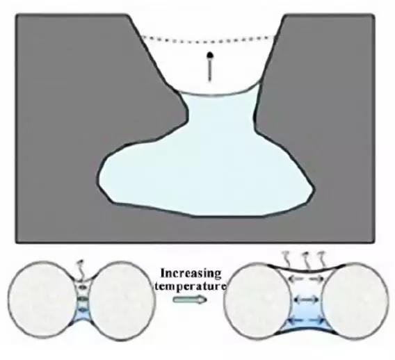 水份向表面的遷移速率時,在靠近表面的粒子之間將會形成復雜的毛細管體系,如圖 3和圖4所示,并在毛細管壁產生毛細壓力 Pc,使毛細孔壁之間或由液體膜分開的兩顆粒之間產生收縮引力 Fa,使得兩粒子被壓縮靠近,此時混凝土尚未形成強度,當收縮驅動力大于顆粒間的抗拉強度時,則出現塑性收縮裂縫,主要發生于早期。