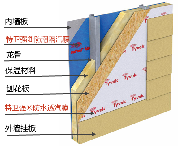 防水透汽膜在輕鋼結(jié)構(gòu)或木結(jié)構(gòu)的應(yīng)用是其最早的應(yīng)用方式,一方面其防風性能給建筑提供了一道很好的氣密屏障,降低了空氣滲透導(dǎo)致的對流散熱,讓建筑更節(jié)能;另一方面其透汽性能幫助圍護結(jié)構(gòu)內(nèi)的水蒸氣擴散,避免建筑受冷凝的損害,保持結(jié)構(gòu)的自然干燥,提高輕鋼或木結(jié)構(gòu)主體的使用壽命。